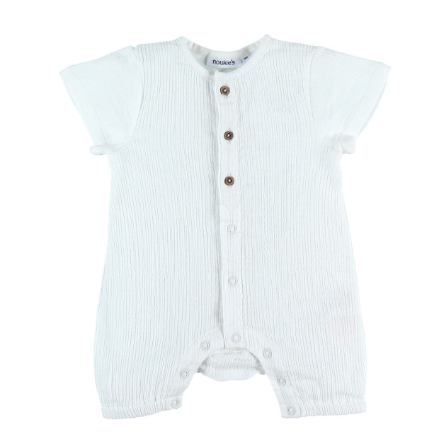 Wit, comfortabel pakje uit BIO katoencrêpe met jersey stof met elastaan op de rug, en ultra handige knopen vooraan om het verschonen te vergemakkelijken! Wij zijn helemaal fan van de houten knopen die het natuurlijke, authentieke aspect van de katoencrêpe extra accenturen!