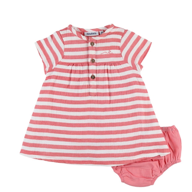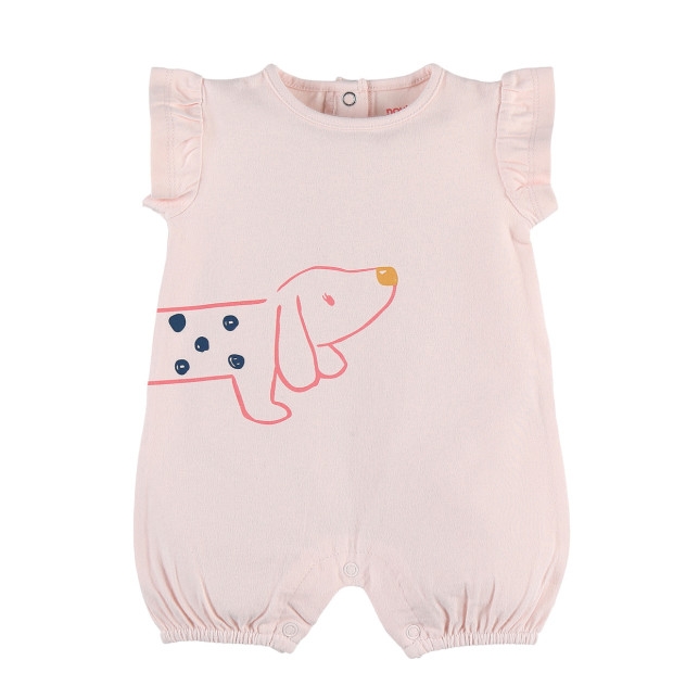 Roze, comfortabel pakje uit jersey BIO katoen en elastaan met hondje, ronde hals met handige drukknopen op de rug en ter hoogte van het kruis, en mouwen met franjes.